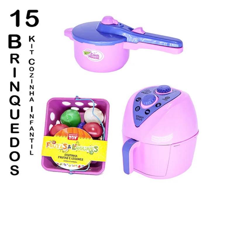 O Kit vem com Air Fryer Panelinha de Pressão Cestinha de Mercado com Frutinhas e Legumezinhos 15pç