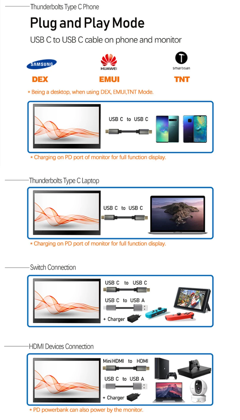 A: Sim, somente uma tomada do cabo e pode jogar, nenhum carregador da necessidade. Se precisar de energia pelo macbook ou telefone celular, pode usar um carregador PD para carregar na porta PD tipo c no monitor. Então ele pode reverter o carregamento do seu macbook ou S8 +.