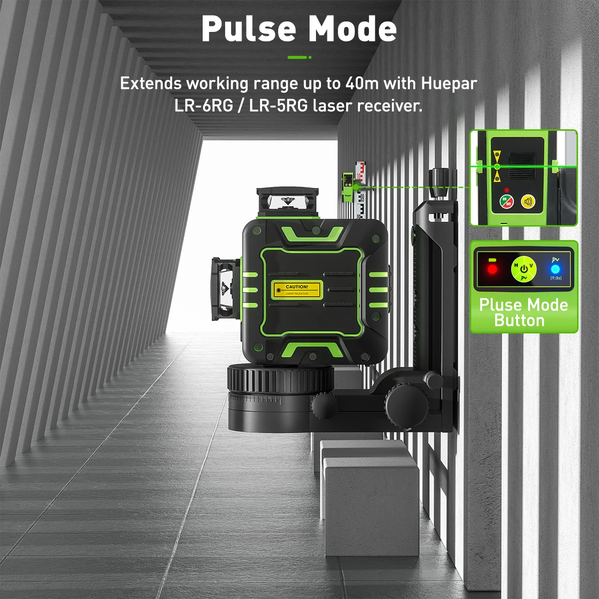 O modo Pulse estende a faixa de trabalho em até 130 pés em condições de trabalho mais brilhantes quando usado com o receptor laser Huepar Line.