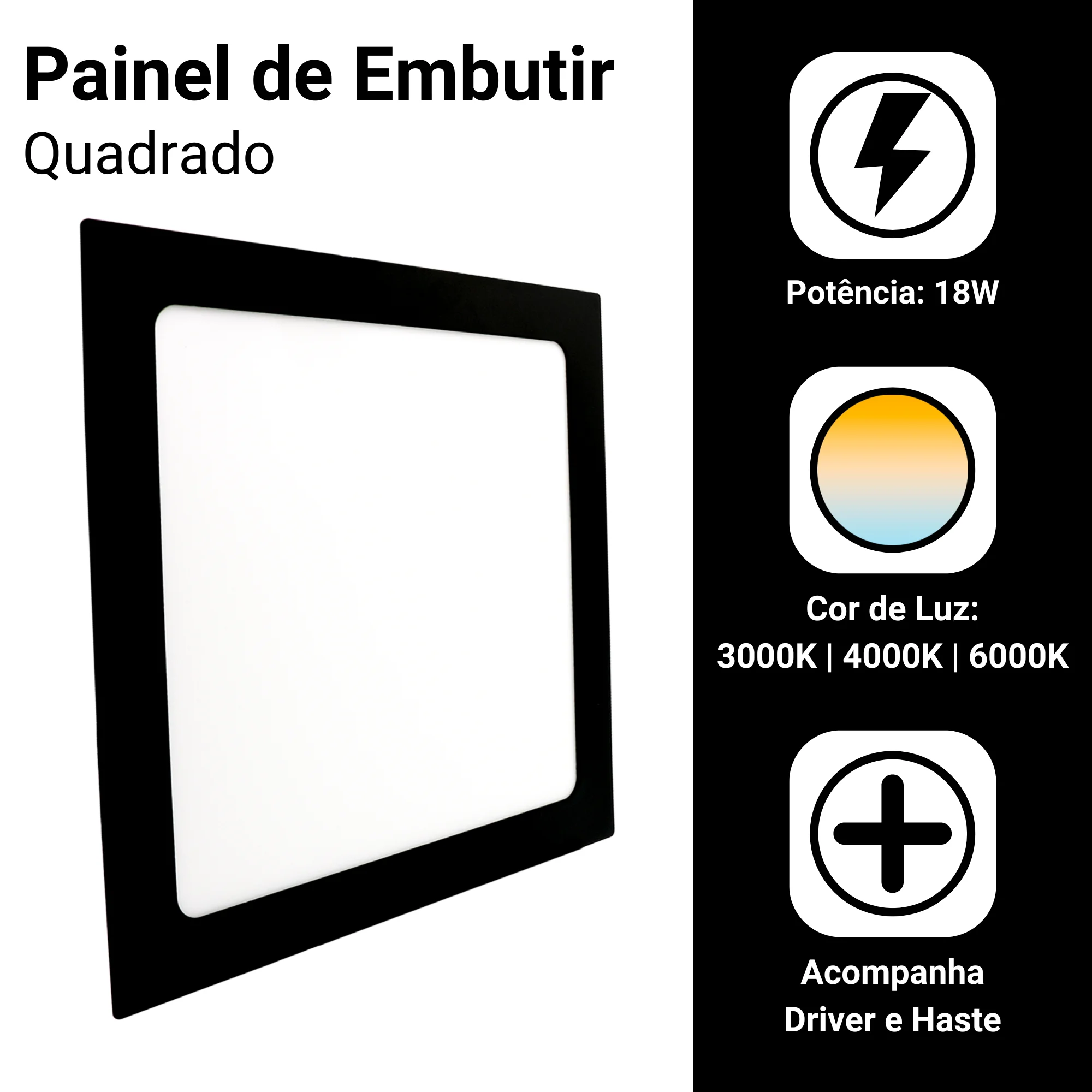 🚩 PAINEL DE LED EMBUTIR PRETO 18W QUADRADO BRANCO FRIO / BRANCO NEUTRO / BRANCO QUENTE