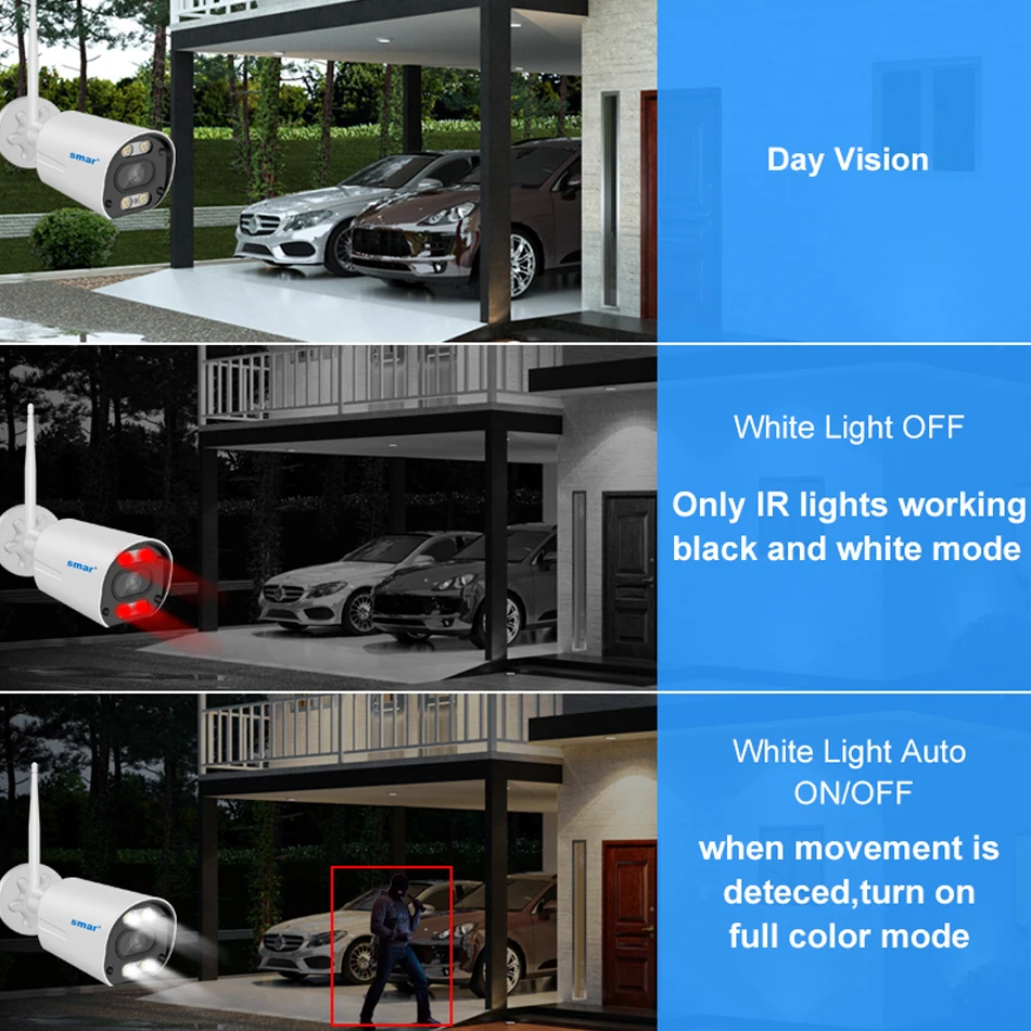 Visão noturna infravermelha: possui LED de pavio de luz dupla de 4 unidades e suporta três modos (visão diurna, visão noturna, visão noturna em cores, distância infravermelha: 10-20M), quando o movimento é detectado, ligue o modo colorido.