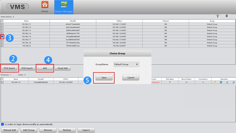 3.Clique no gerenciador de dispositivos - pesquisa IPV4 - escolha o endereço da câmera IP - ADD-SAVE, pesquisa e câmera com sucesso;