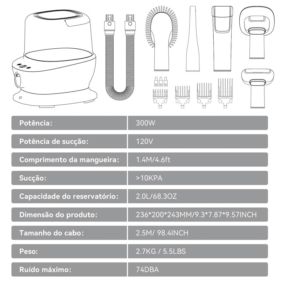 Doze. Acessórios: máquina de cortar cabo elétrica, escova de limpeza, pente de desbaste, pente de pescoço, sucção plana