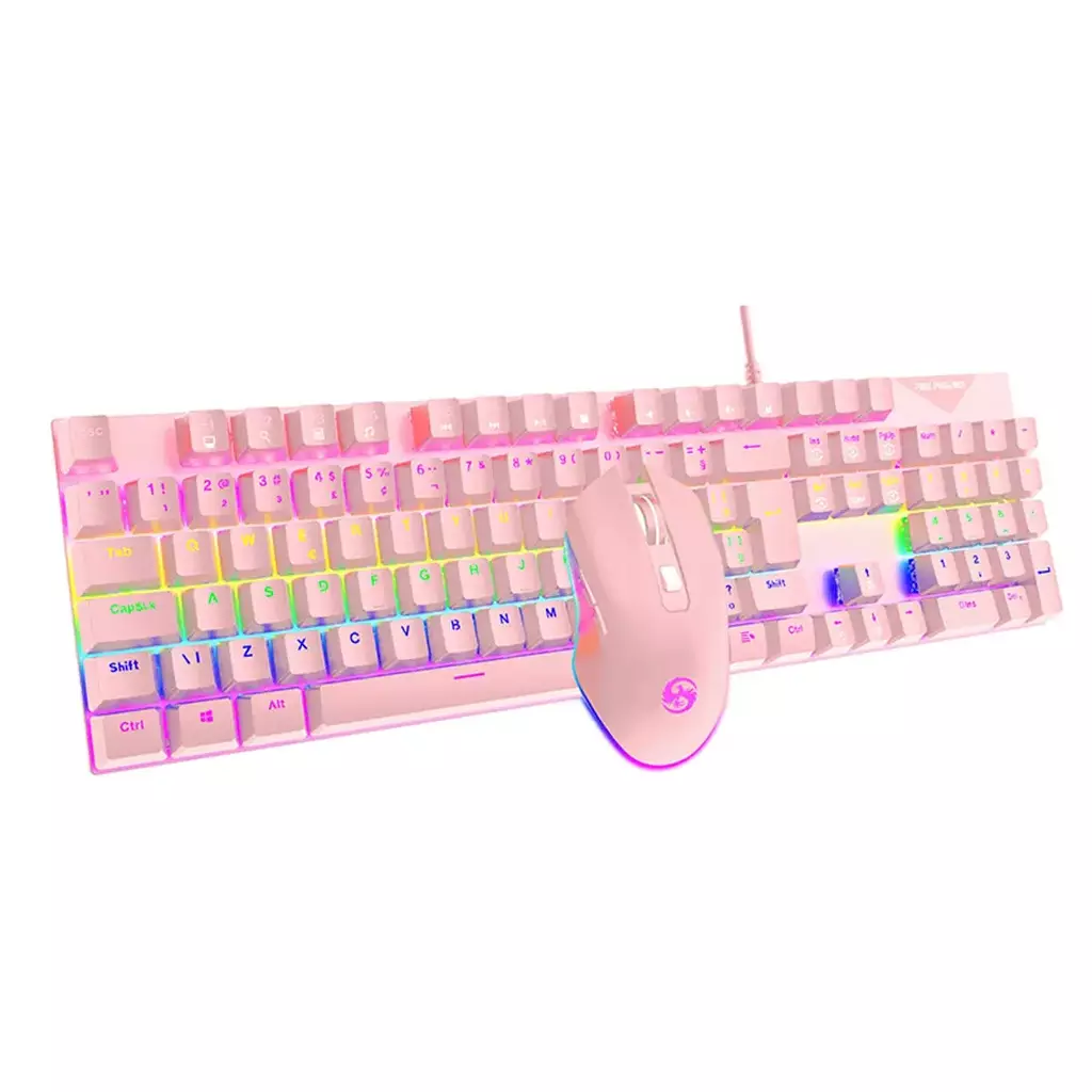 KIT TECLADO GAMER MECANICO ROSA E MOUSE, SWITCH BLUE ANTI-GHOSTING COM DIVERSOS EFEITOS, PARA PC/COMPUTADOR, PS4 PS5 E XBOX. ( JOGOS ONLINE OU OFFLINE )