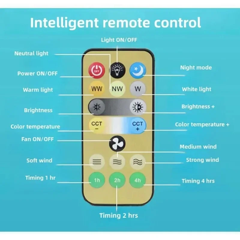 Remote Control: Adjust 3 light sources, brightness, 3 speed wind, and timing function.