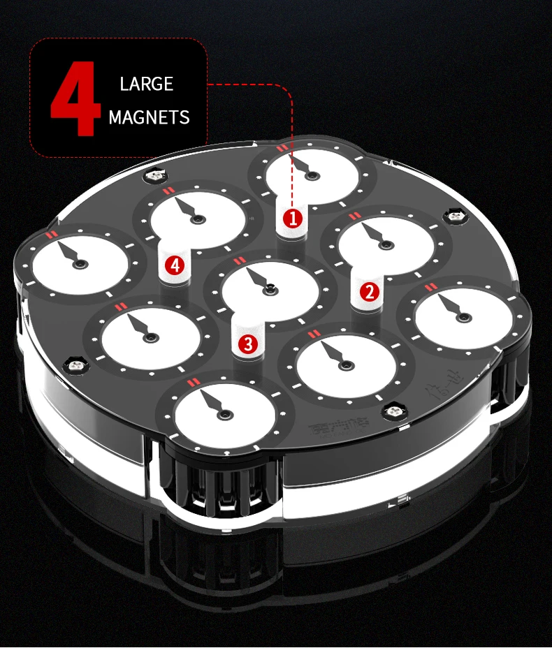O relógio QiYi é um relógio magnético do famoso fabricante speedcube QiYi MoFangGe.Este novo relógio requintado é totalmente magnético, apresentando 204 pequenos ímãs embutidos nas engrenagens e 4 ímãs grandes dentro dos pinos.O exterior deste novo relógio foi projetado usando incrustações complexas em vez de impressão tradicional.Para o conforto do usuário, QiYi arredondou as rodas do relógio para ser facilmente utilizável sem raspar os dedos.De forma fascinante, o relógio QiYi pode ser tensionado ajustando seus quatro parafusos.O QiYi Clock também pode ser facilmente aberto para lubrificação e manutenção.