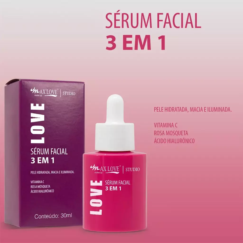 O Sérum Facial 3 em 1 Max Love combina os benefícios da Vitamina C, Rosa Mosqueta e Ácido Hialurônico em um único produto, proporcionando ação antioxidante e hidratante. Conta ainda com D'Pantenol, Extrato de Gengibre, Extrato de Figo, Extrato de Aloe Vera, Extrato de Algas Marinhas e Extrato de Algodão, componentes que juntos, oferecem ação emoliente e refrescante. Pele mais firme, macia, hidratada e iluminada. Fórmula vegana, livre de parabenos e livre de petrolatos.
