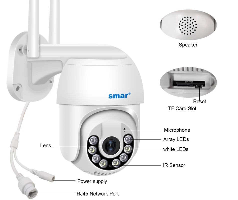 A câmera PTZ tem 4pcs Array Leds + 4pcs LEDs brancos e suporta três modos (visão diurna, visão noturna, visão noturna em cores), quando o movimento é detectado, ative o modo em cores.