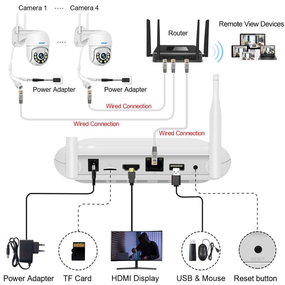 O NVR sem fio suporta duas maneiras de acessar com e sem fio à câmera (suportado por alguns modelos).Os dois modos são definidos como segue: