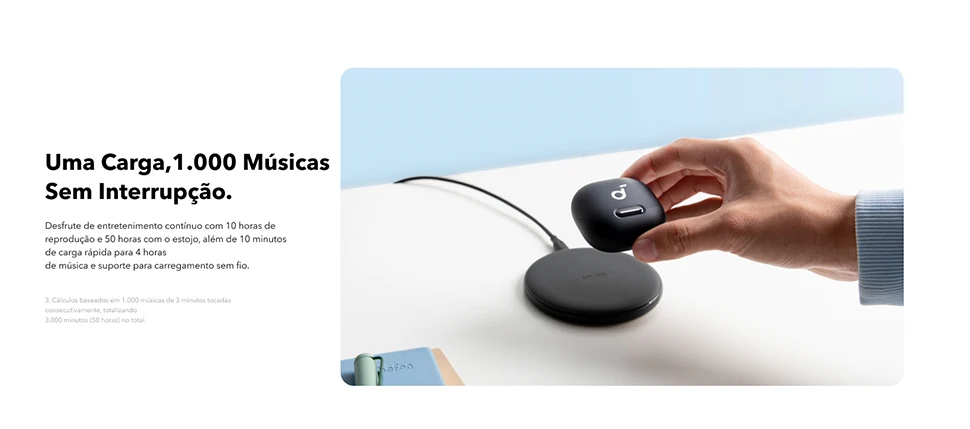 10 minutos de carregamento rápido para 4 horas de música e carregamento sem fio.