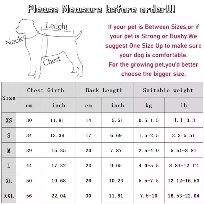 S Circunferência torácica 34 cm/13,78''; Comprimento das costas 17 cm/6,69''; Peso sugerido 1,5-2,5 kg/3,51 lbs